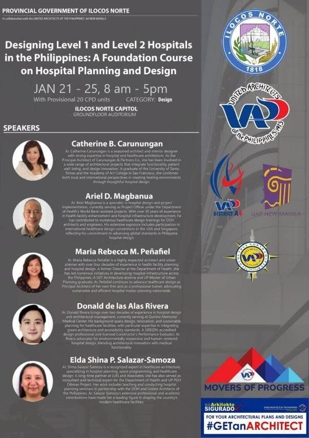 The UAP QC Diliman Chapter takes pride in the participation of Elda Shina S. Samoza, a Diliman Chapter member, who was invited as a lecturer by Northstar Professional Learning & Development Center, Inc. for the 5-day seminar/workshop entitled “Designing Level 1 and Level 2 Hospitals in the Philippines: A Foundation Course on Hospital Planning and Design.” The activity, with provisional 20 CPD units, was held at the Ilocos Norte Capitol Auditorium from January 21 to 25, 2026, and was offered to practicing architects nationwide.